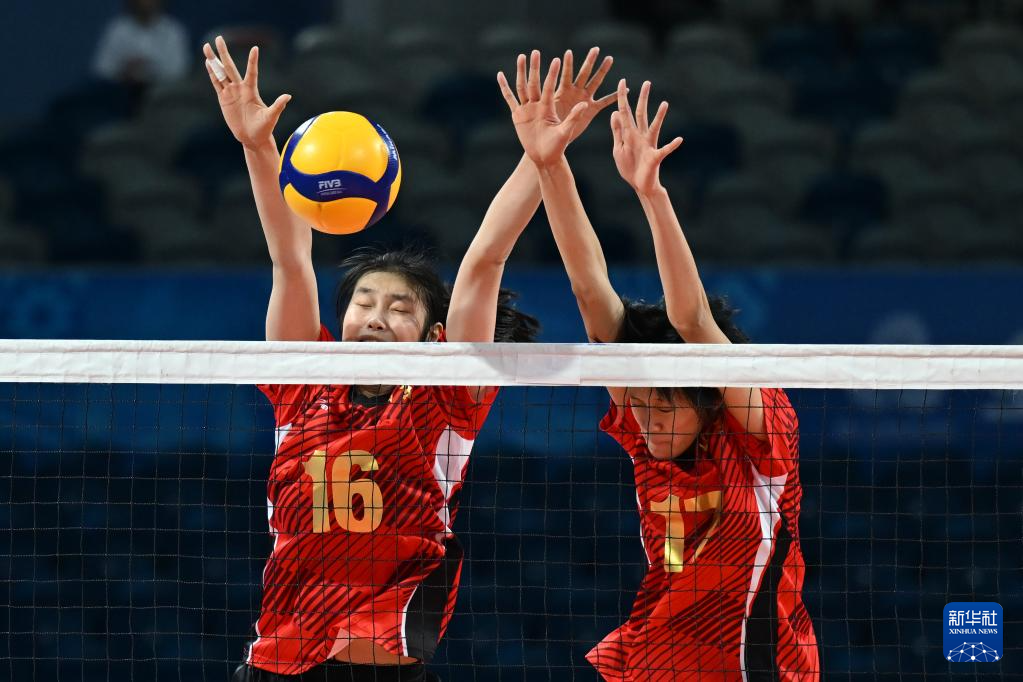 11月17日,山东队球员张靖蕙如(左)、司静雨在比赛中拦网。