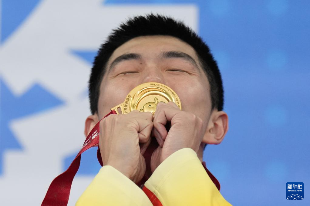 11月17日,湖北队选手闫子贝在颁奖仪式上亲吻金牌。
