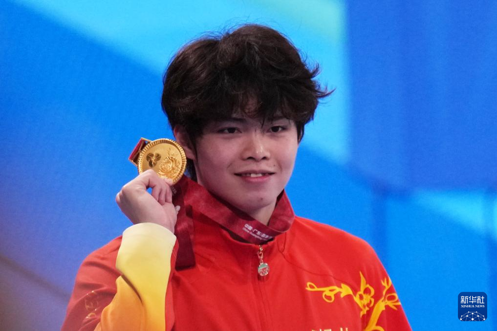 11月17日,冠军湖北队选手徐海博在颁奖仪式后展示金牌。