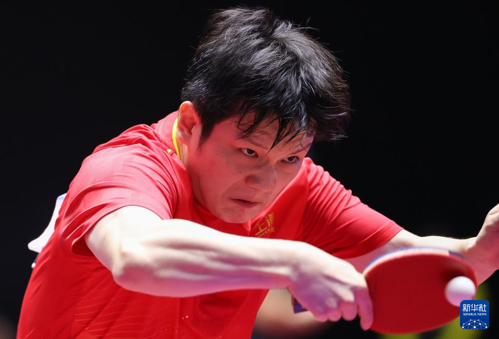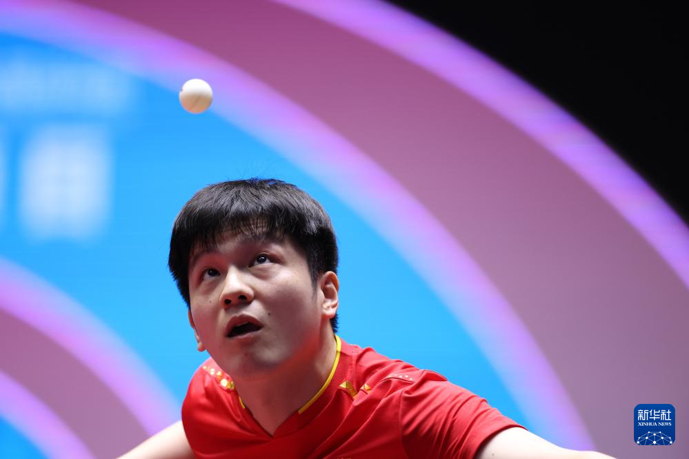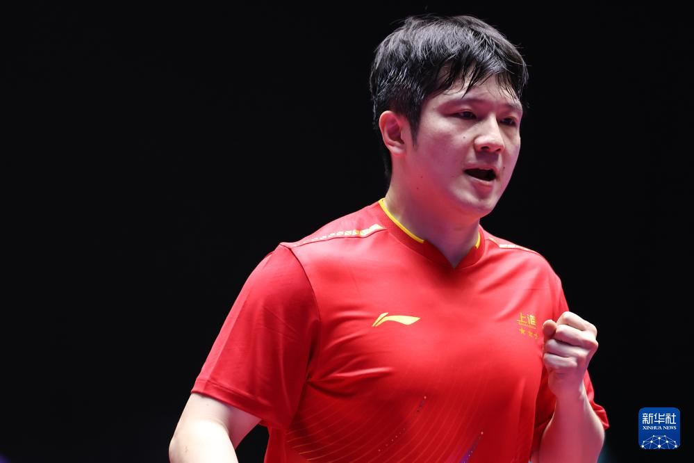 11月17日,上海队选手樊振东在比赛中。他3比2战胜河南队选手于何一。