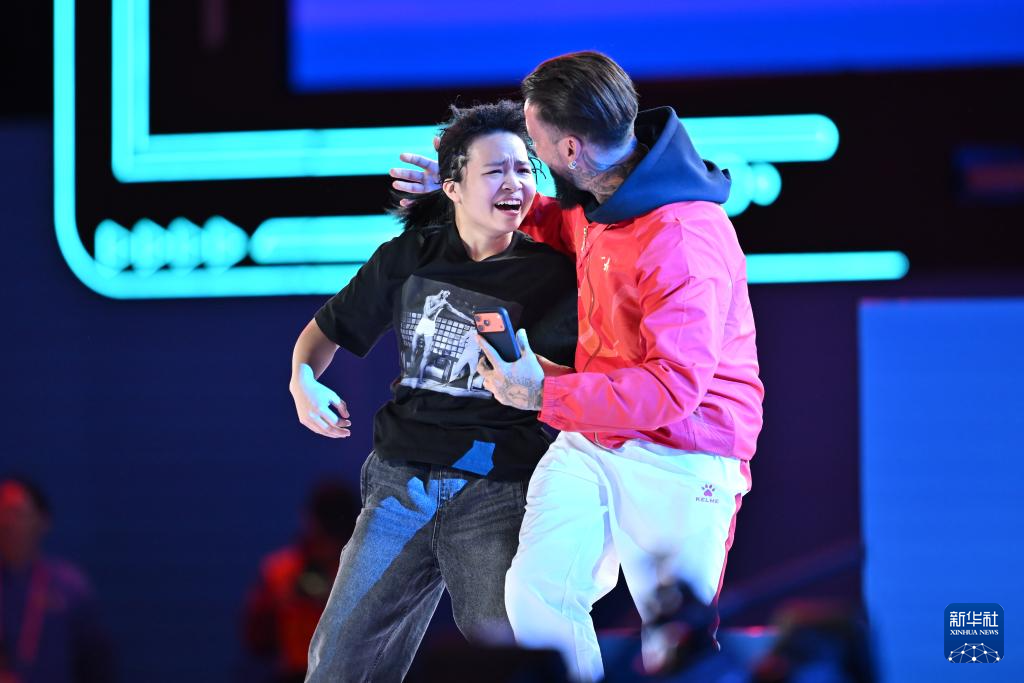 11月18日,河南队选手刘清漪(中)和山东队选手郭朴在比赛后拥抱致意。刘清漪获得冠军。
