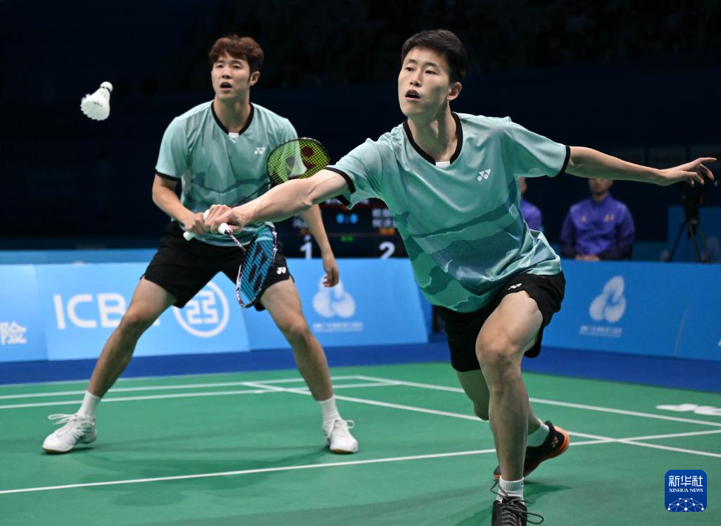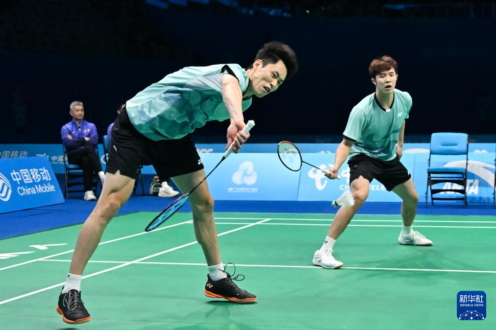 11月19日,福建队组合欧烜屹/何济霆(右)在比赛中。