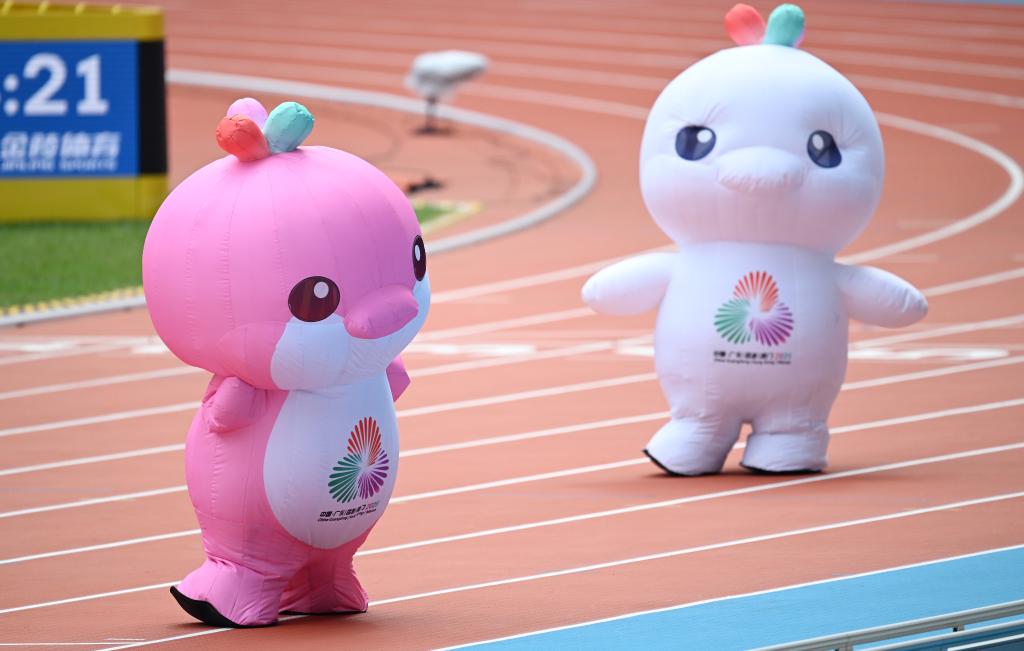 11月15日,吉祥物“喜洋洋”和“乐融融”在比赛间隙表演。当日,第十五届全国运动会田径项目在广州开赛。新华社记者 邓华 摄