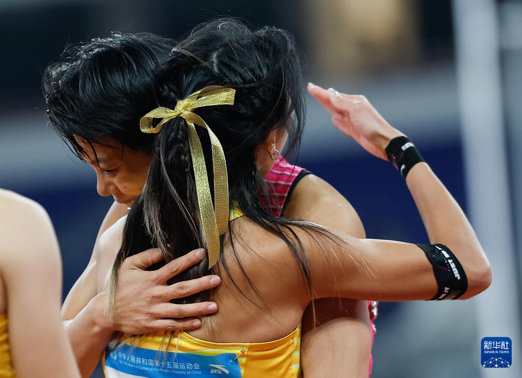11月18日,广东队选手刘景扬(右)和福建队选手林雨薇在比赛后拥抱。她们分获冠军和季军。