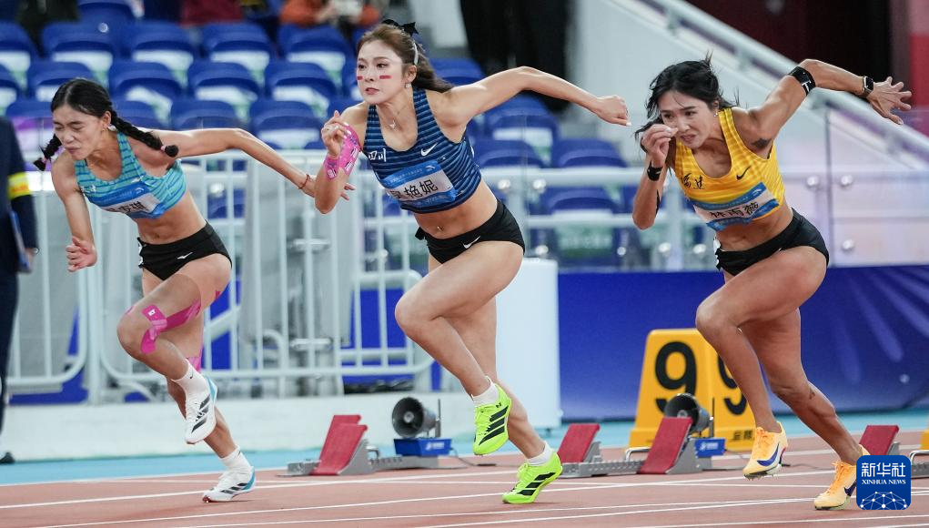 11月19日,广东队选手刘景扬(右一)、四川队选手吴艳妮(左一)、福建队选手林雨薇(左二)在比赛中冲线。她们分获冠、亚、季军。