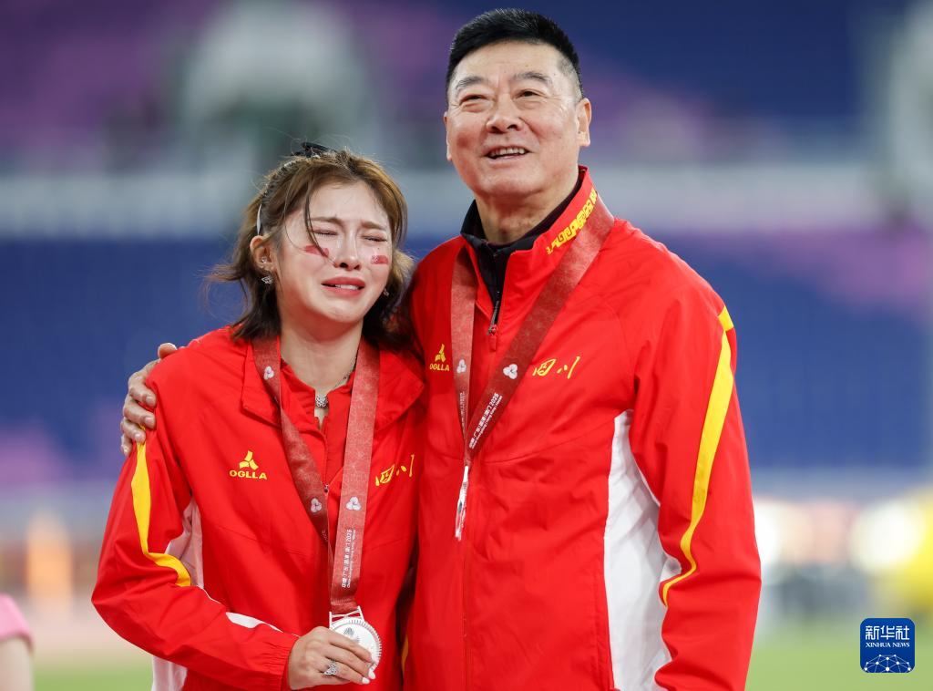 11月19日,获得亚军的四川队选手吴艳妮(左)在颁奖仪式上哭泣。