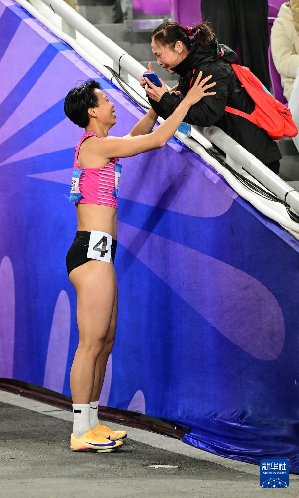 11月19日,广东队选手刘景扬(左)在比赛后和母亲交流。她夺得冠军。