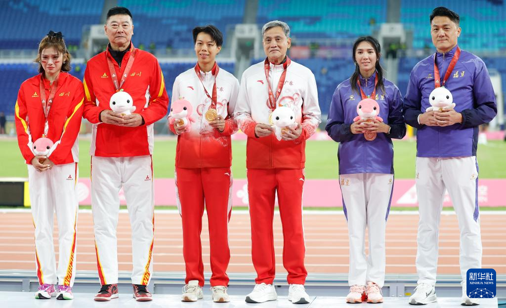 11月19日,获得冠军的广东队选手刘景扬(左三)、获得亚军的四川队选手吴艳妮(左一)、获得季军的福建队选手林雨薇(右二)在颁奖仪式上与教练合影。