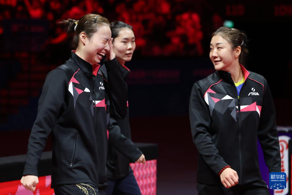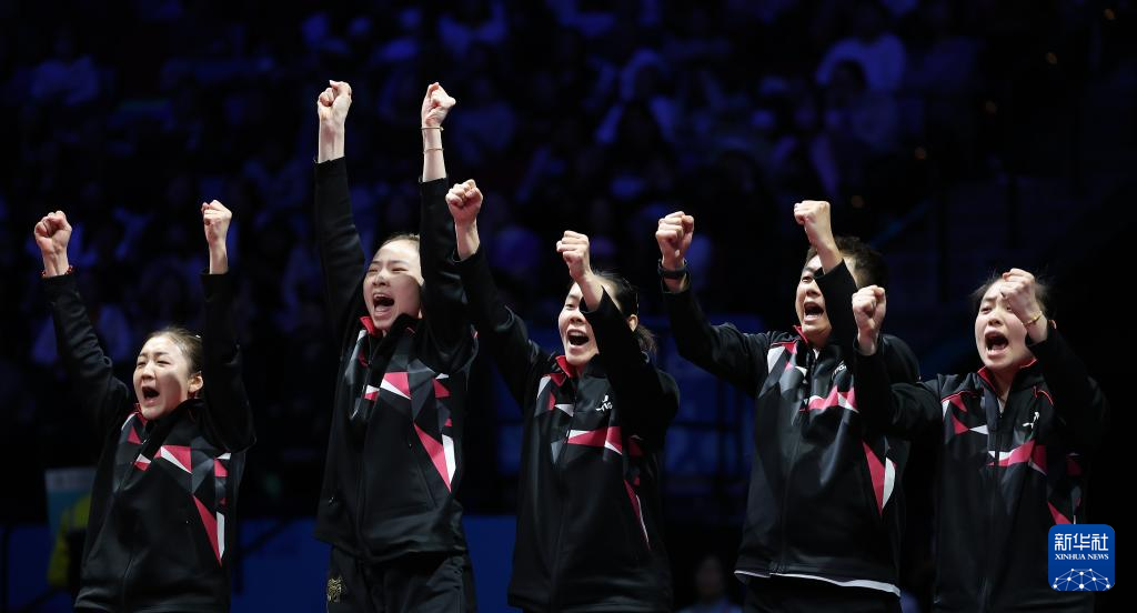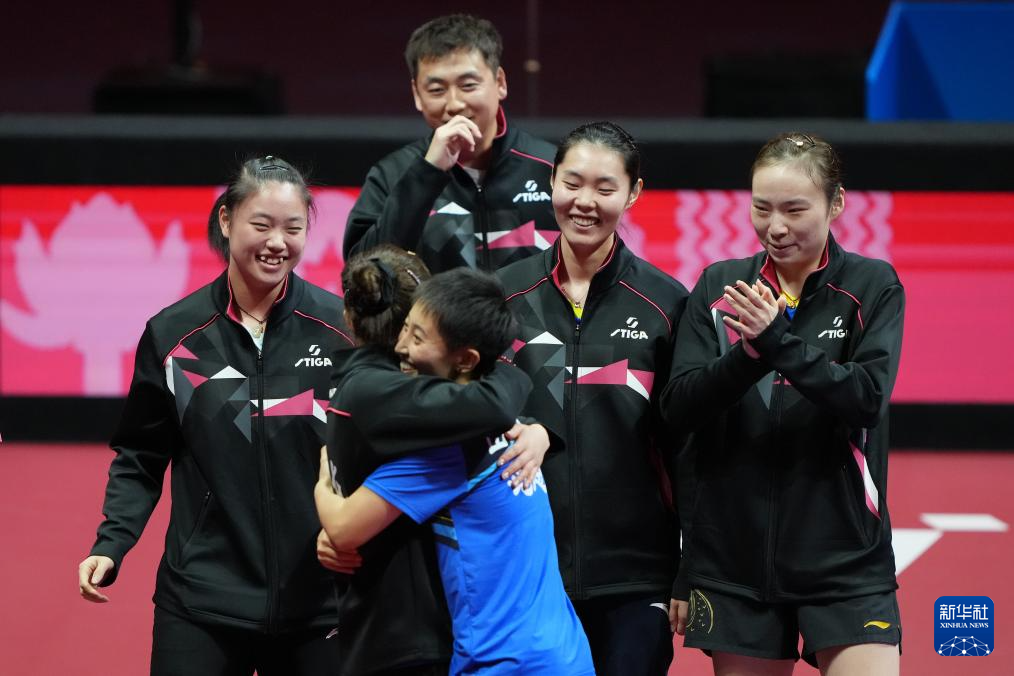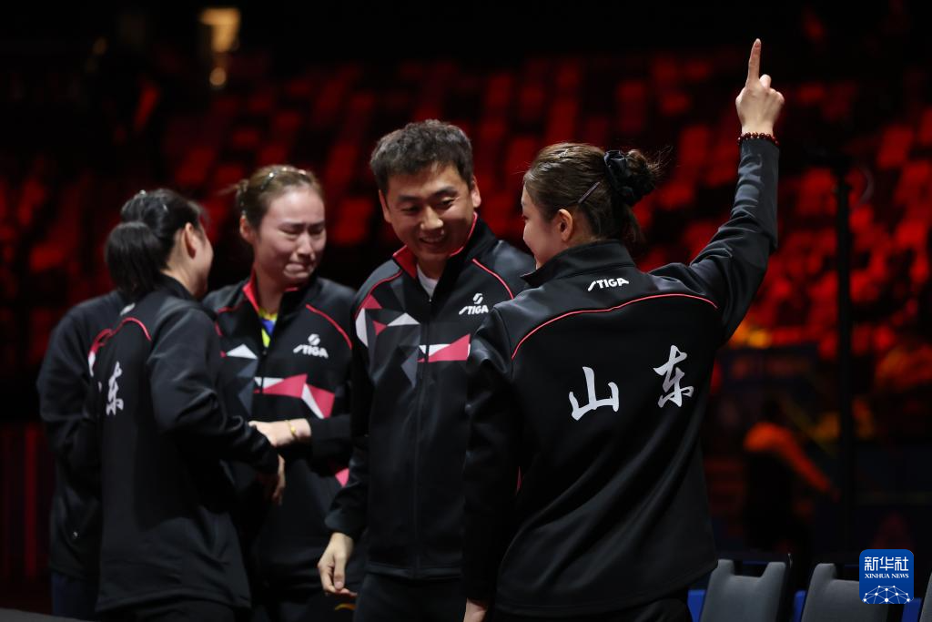11月19日,山东队选手范思琦(左二)和队友陈梦(左三)庆祝夺冠。范思琦在女单比赛中3比2战胜河北队选手何卓佳。
