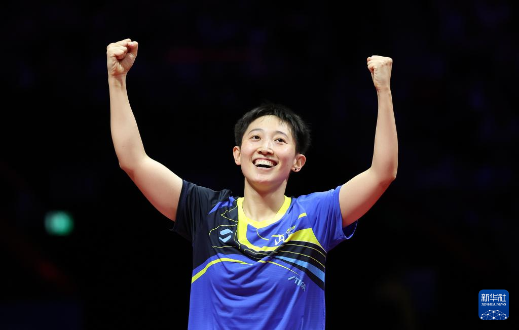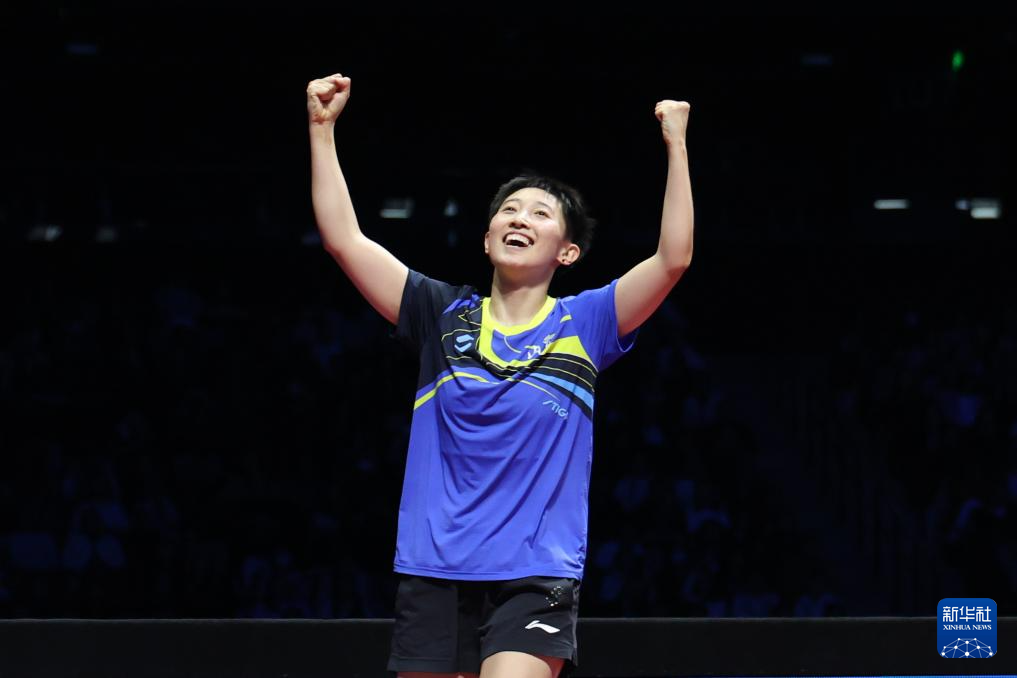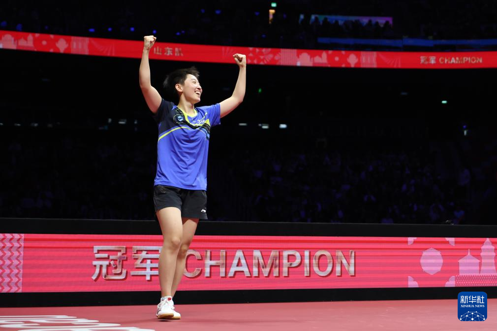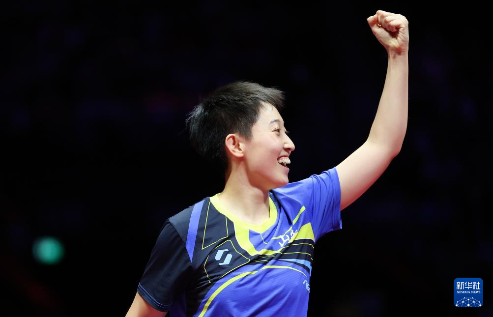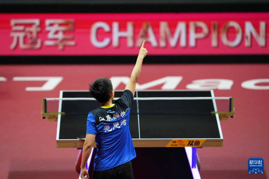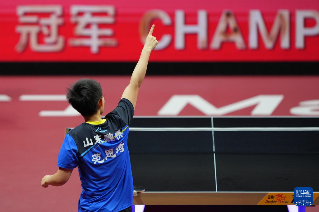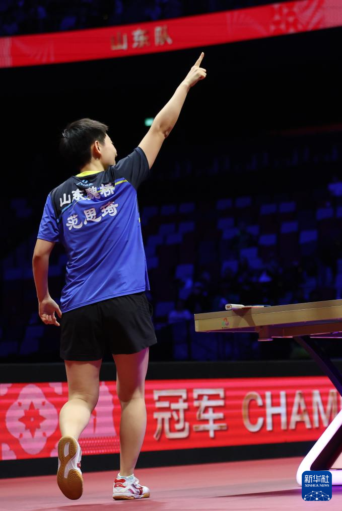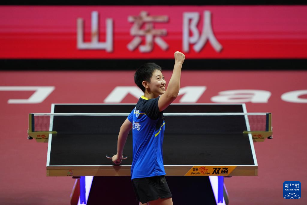 11月19日,山东队选手范思琦庆祝比赛获胜。她在女单比赛中3比2战胜河北队选手何卓佳。