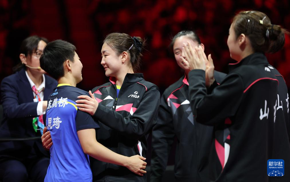 11月19日,冠军山东队成员陈梦(右)和亚军河北队成员孙颖莎在颁奖仪式上相互致意。