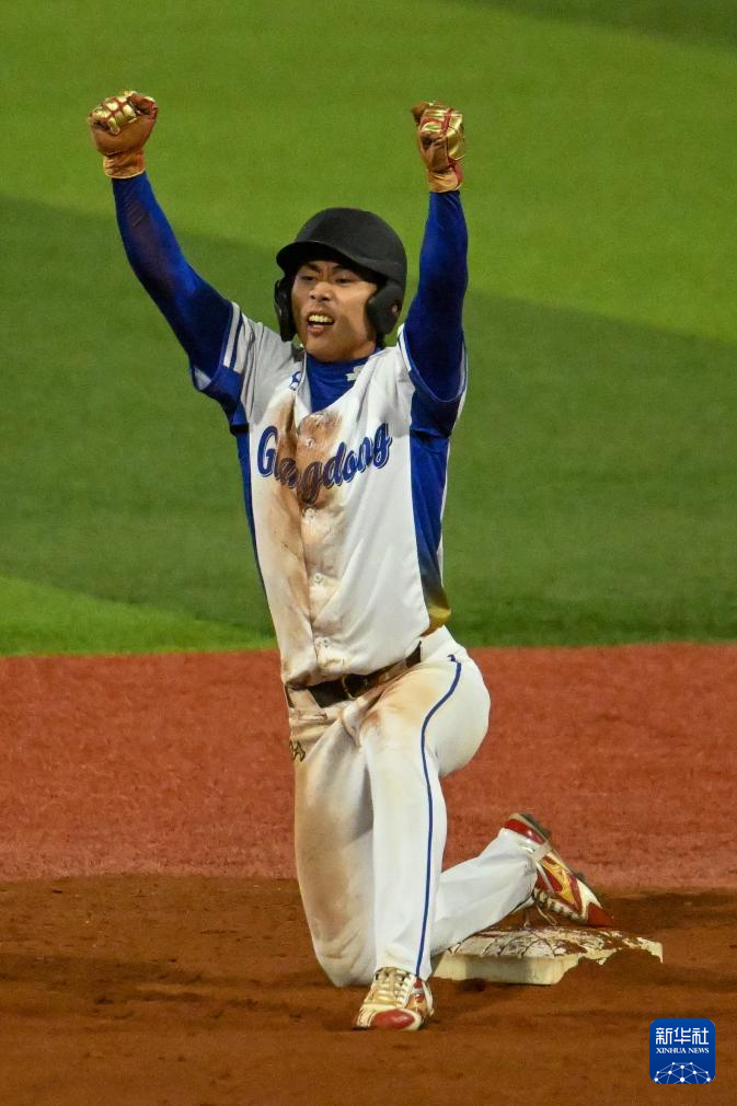 11月19日,广东队球员吴启锐在比赛中庆祝上垒。