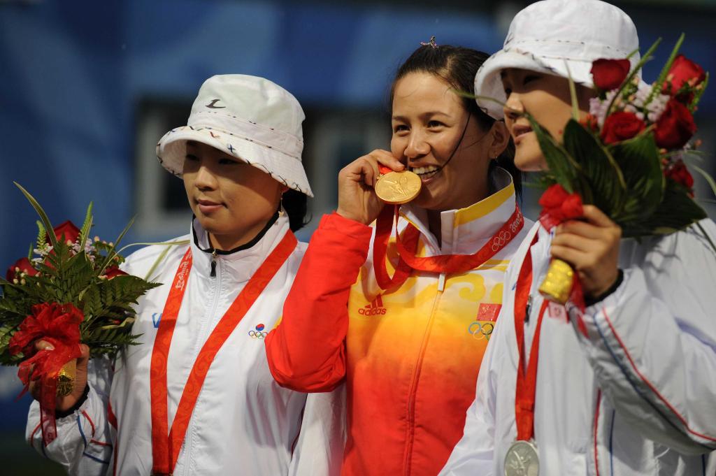 2008年8月14日,在北京奥运会射箭女子个人决赛中,中国选手张娟娟(中)获该项目金牌,韩国选手朴成贤(右)、尹玉姬分获银牌和铜牌。 新华社记者 张领 摄
