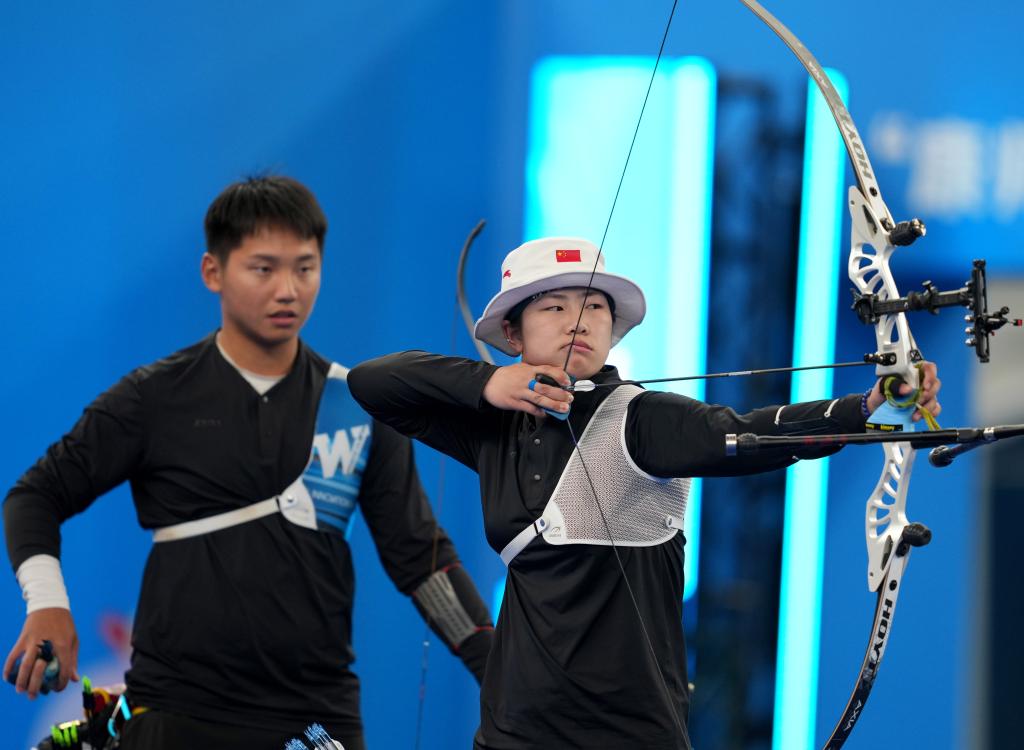湖北组合考文超/宗钰在反曲弓混合团体比赛中站上最高领奖台。在他们夺冠的征途中,宗钰有一次射箭时做完准备动作后并未出手,等她第二次出手后,留给考文超的时间已经不多,考文超不仅在击发时间耗尽前快速射出一箭,而且还命中10环。这一次极限操作,展现了两人极强的默契度。