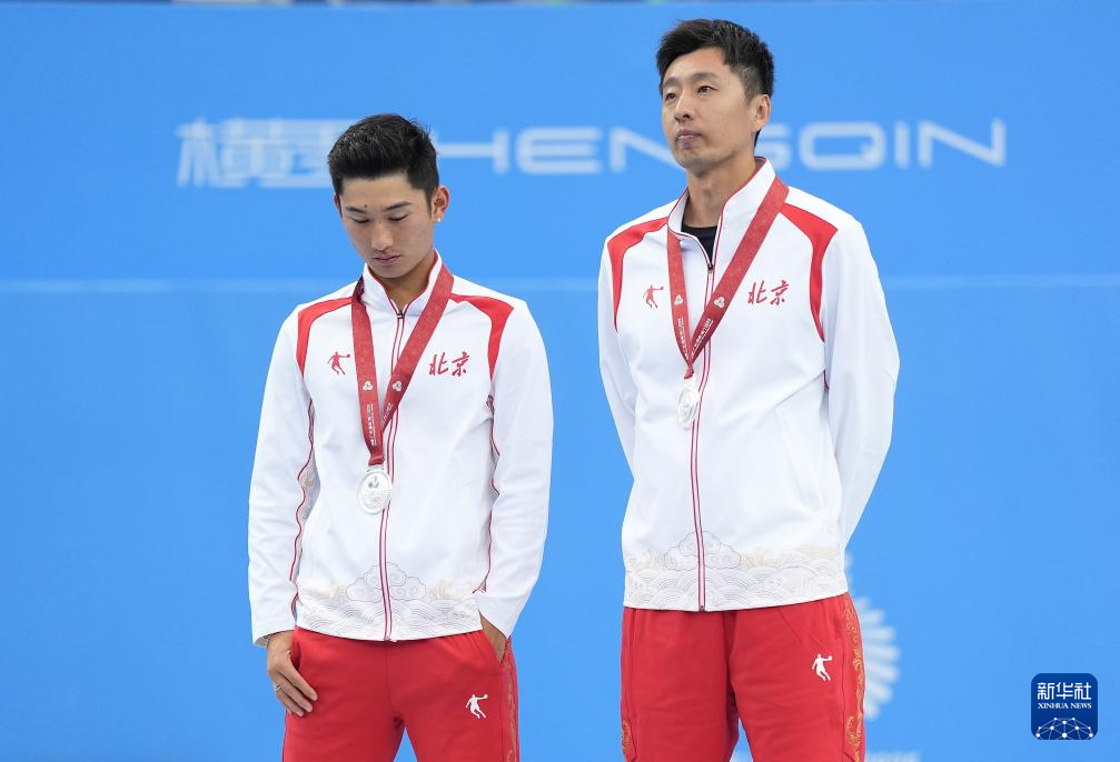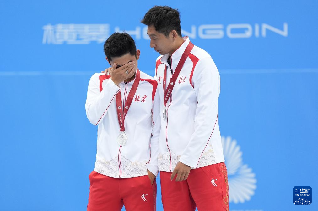 11月20日,获得亚军的北京队选手商竣程(左)与教练在颁奖仪式上。