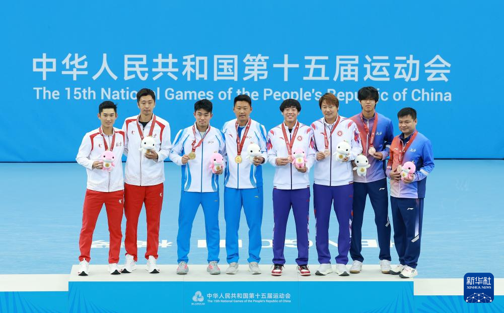 11月20日,获得冠军的浙江队选手吴易昺(左三)、获得亚军的北京队选手商竣程(左一)、获得季军的广西队选手周意(右二)和香港队选手黄泽林(右四)与教练一起在颁奖仪式上。