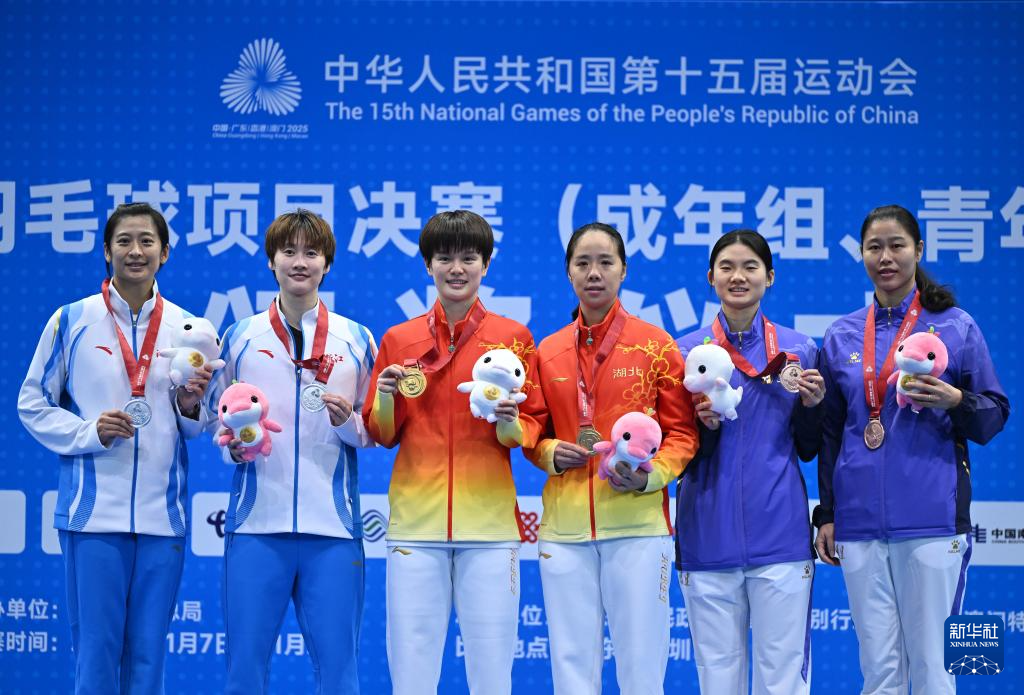 11月20日,冠军湖北队选手王祉怡(左三)、亚军浙江队选手陈雨菲(左二)和季军福建队选手韩悦(右二)和教练在颁奖仪式上合影。