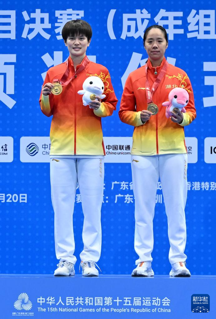 11月20日,冠军湖北队选手王祉怡(左)和教练在颁奖仪式上。