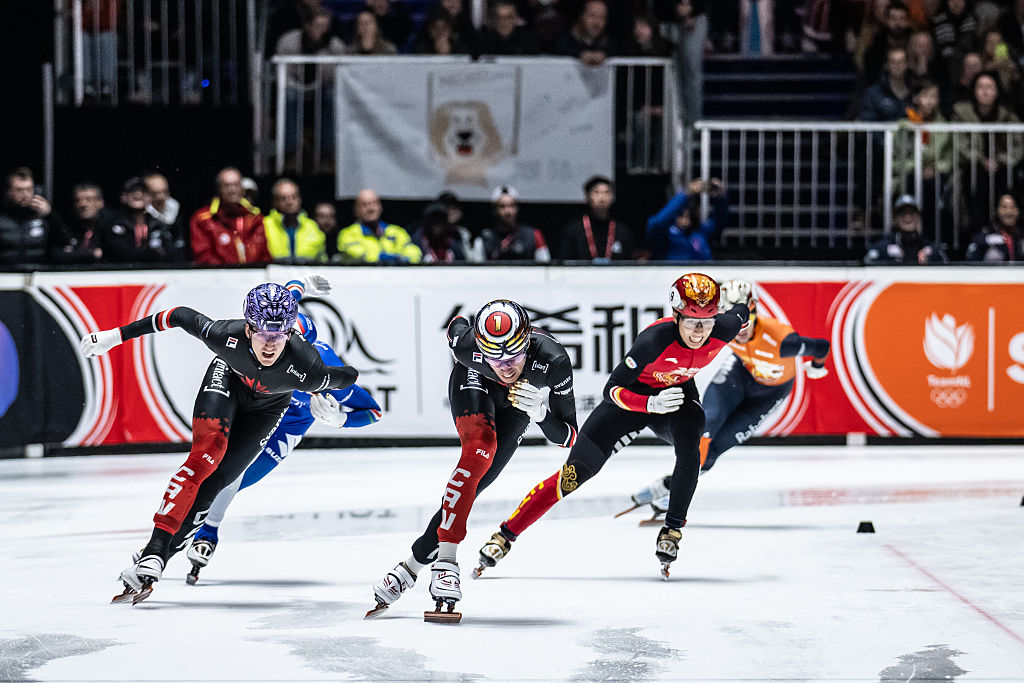 11月29日,丹吉努(中)、鲁塞尔(左)与孙龙(右)在1500米比赛中。图源:国际滑冰联合会官网