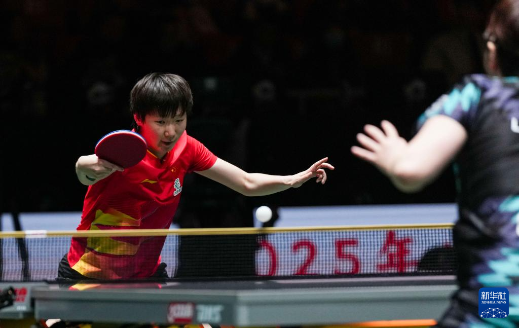 12月4日,中国队选手王曼昱在女单比赛中回球。她3比0战胜韩国队选手李恩惠。