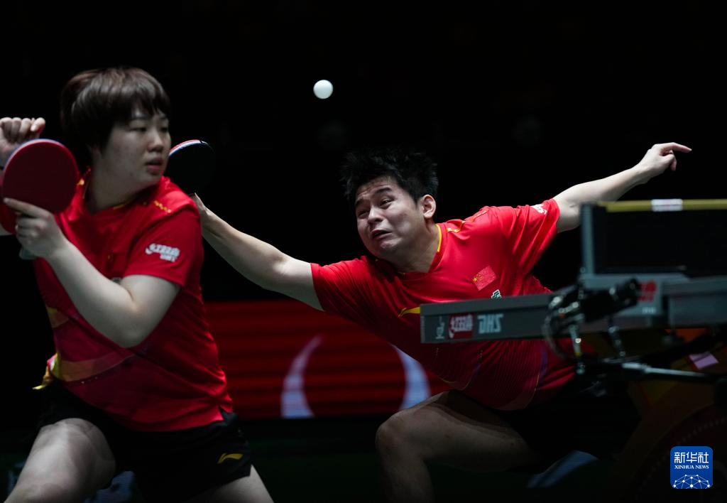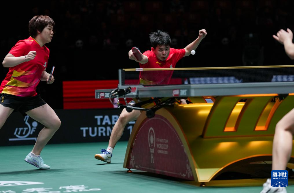 12月4日,中国队组合林诗栋/蒯曼(左)在混双比赛中。他们3比0战胜韩国队组合朴康贤/金娜英。