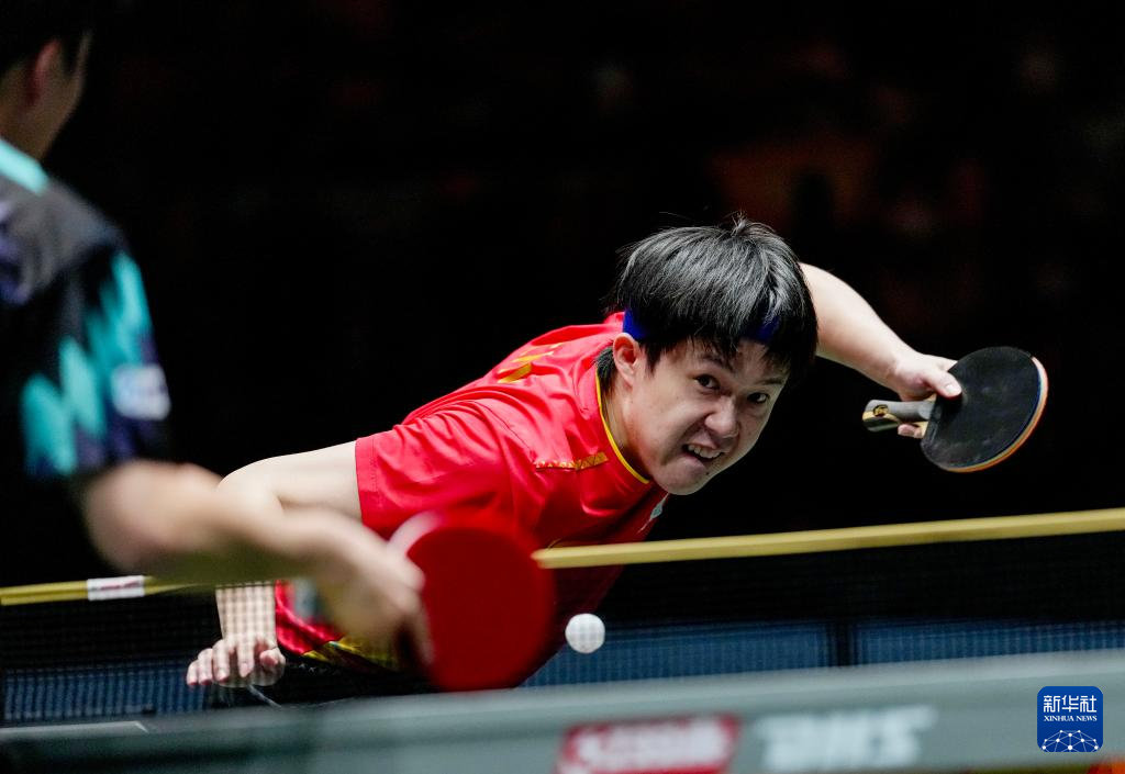 12月4日,中国队选手王楚钦在男单比赛中回球。他2比0战胜韩国队选手安宰贤。