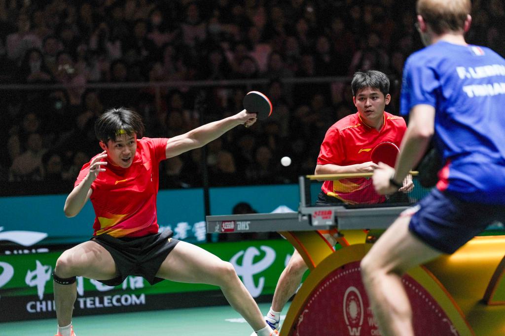 12月4日,中国队组合王楚钦(左)/林诗栋在男双比赛中。新华社记者 王迎 摄