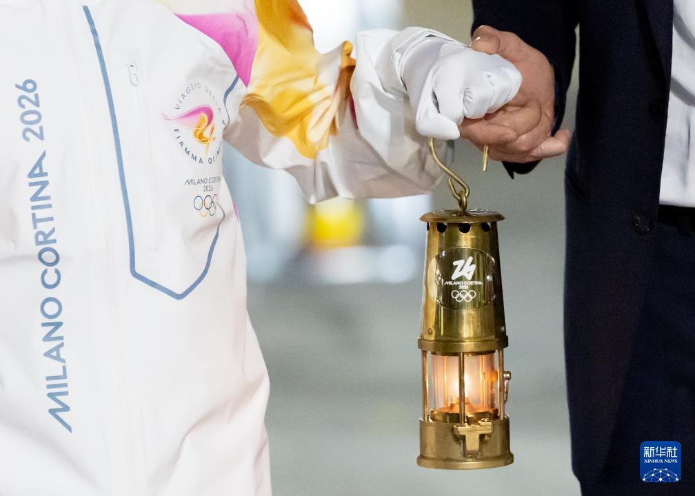 12月4日,意大利网球奥运冠军保利尼(中左)与米兰冬奥会组委会主席、意大利奥委会主席乔瓦尼·马拉戈(中右)携火种灯抵达罗马菲乌米奇诺机场后接受采访。