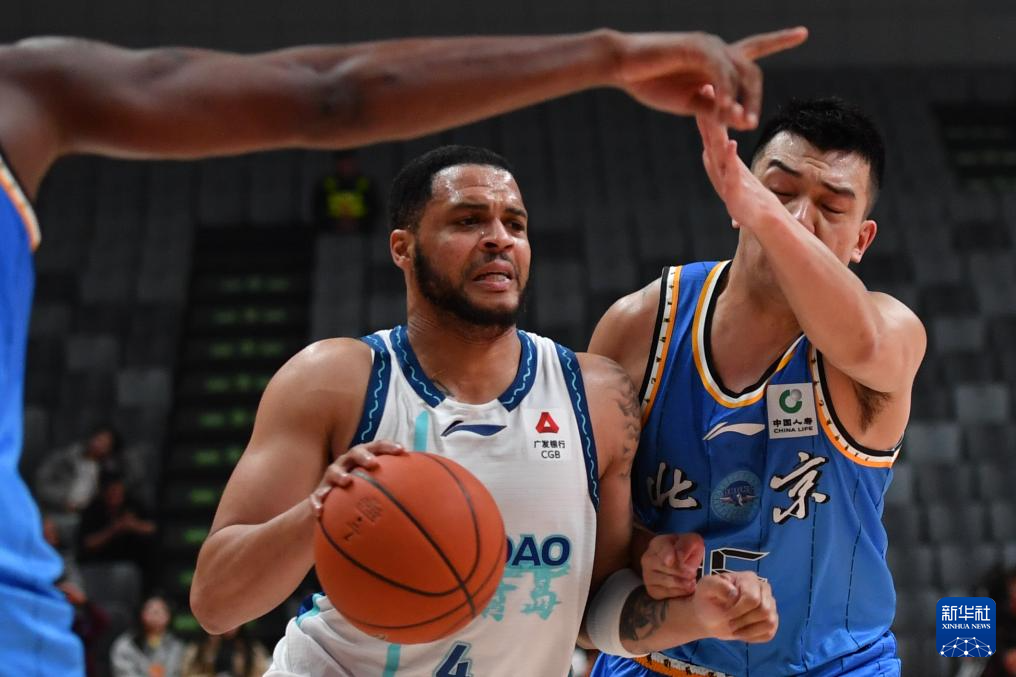12月4日,青岛崂山啤酒队球员米奇(右二)在北京北汽队球员斯佩尔曼(左二)防守下投篮。