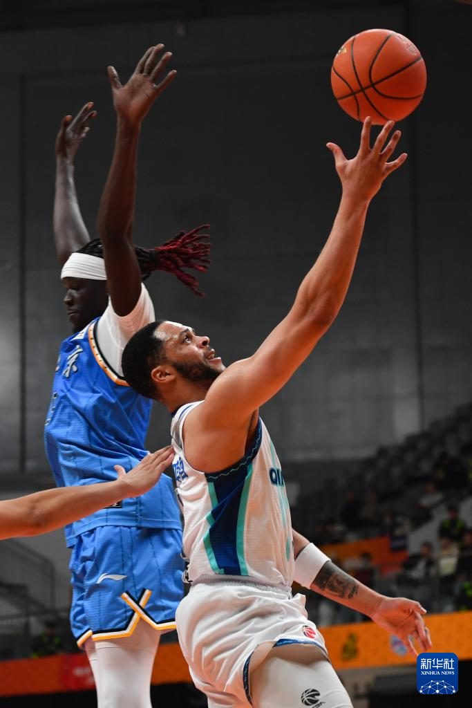 12月4日,青岛崂山啤酒队球员米奇(左二)在比赛中扣篮。