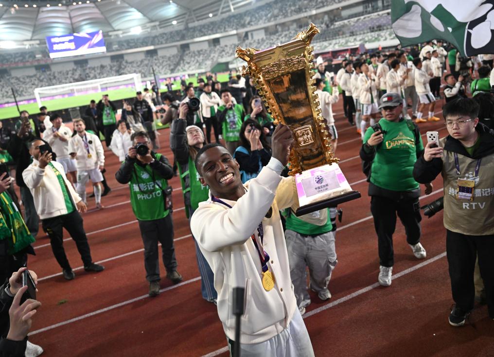 12月6日,北京国安队球员侯森比赛后庆祝夺冠。