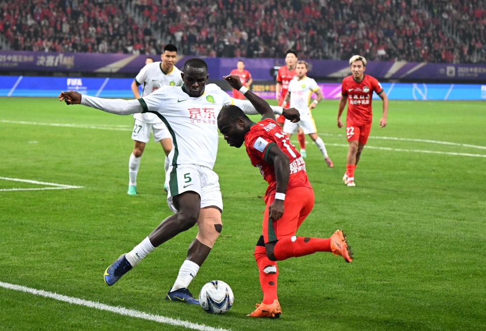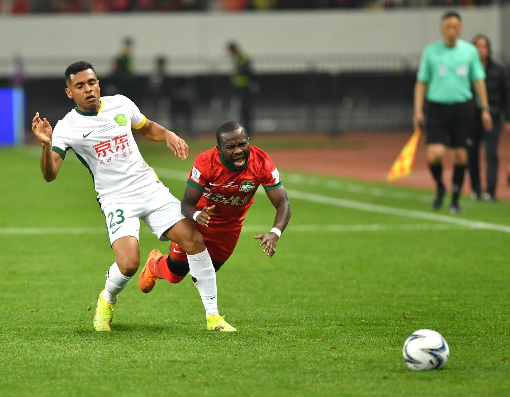 12月6日,河南俱乐部酒祖杜康队球员阿奇姆彭(前右)与北京国安队球员恩加德乌(前左)在比赛中拼抢。