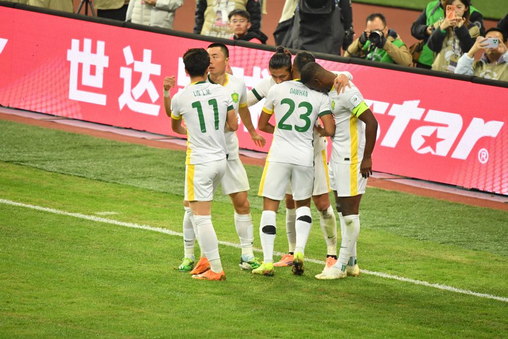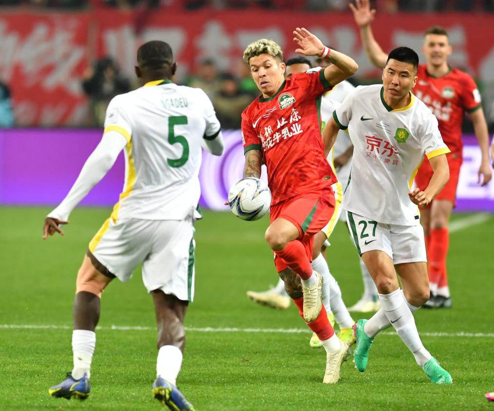 12月6日,北京国安队球员法比奥(右一)在比赛中庆祝进球。