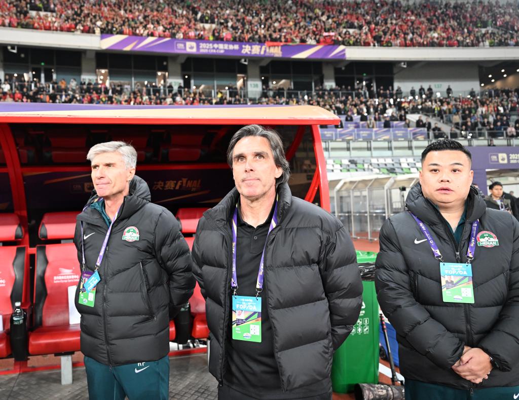 12月6日,中国男足国家队主教练邵佳一在比赛现场观赛。