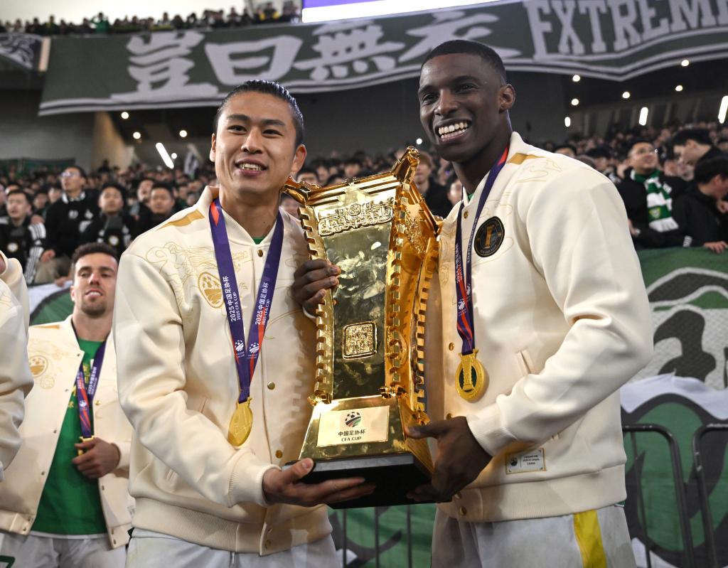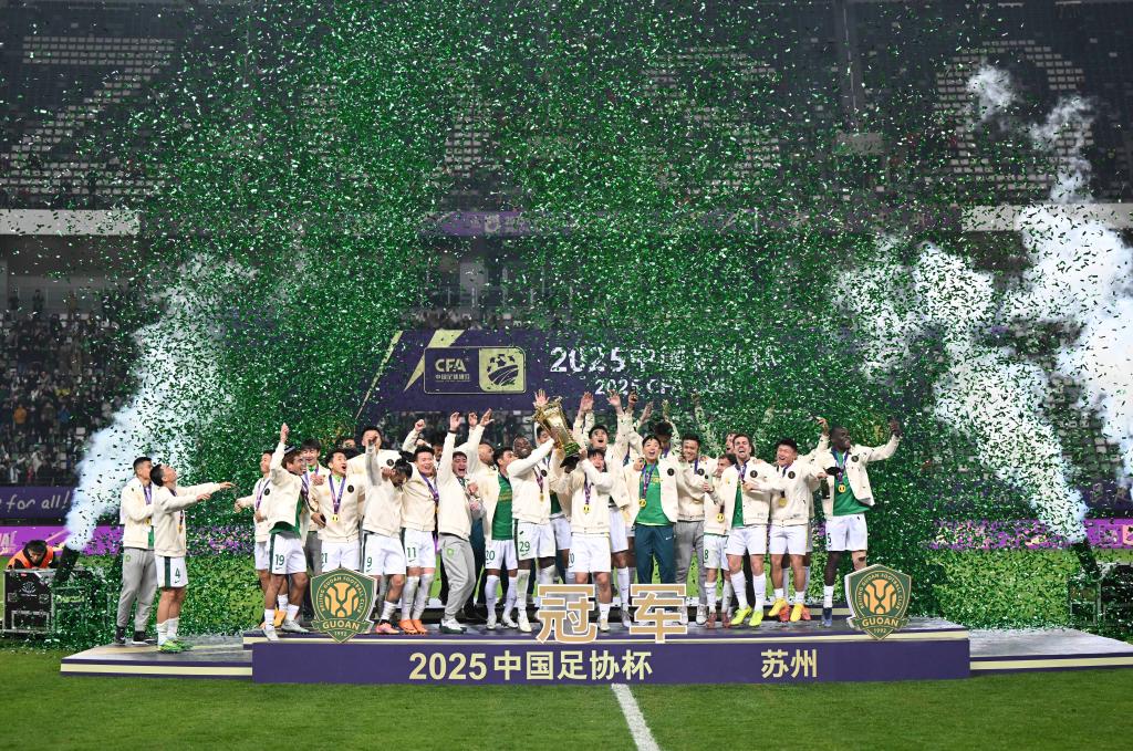当日,在江苏苏州举行的2025中国足球协会杯决赛中,北京国安队3比0战胜河南俱乐部酒祖杜康队,第五次夺得足协杯冠军。