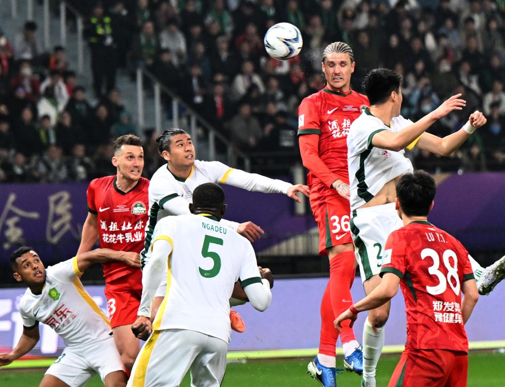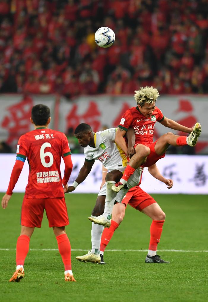 12月6日,河南俱乐部酒祖杜康队球员迈达纳(上)在比赛中争抢头球。