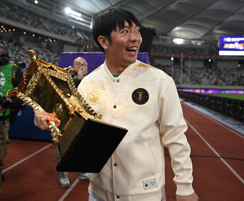 12月6日,北京国安队球员张稀哲在比赛后庆祝夺冠。