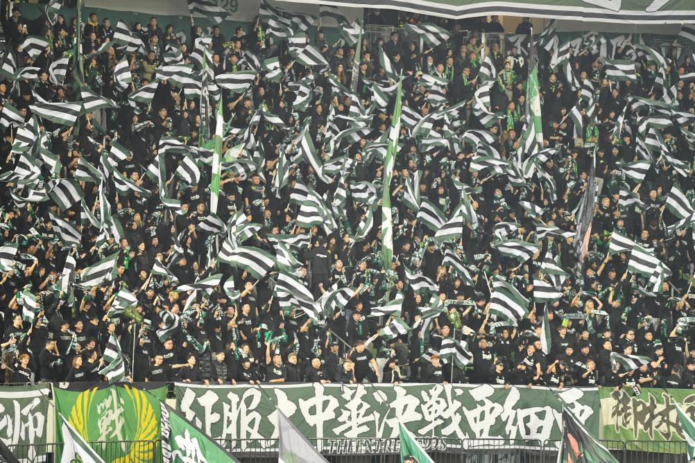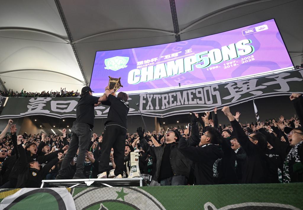 12月6日,北京国安队球迷在比赛后庆祝夺冠。