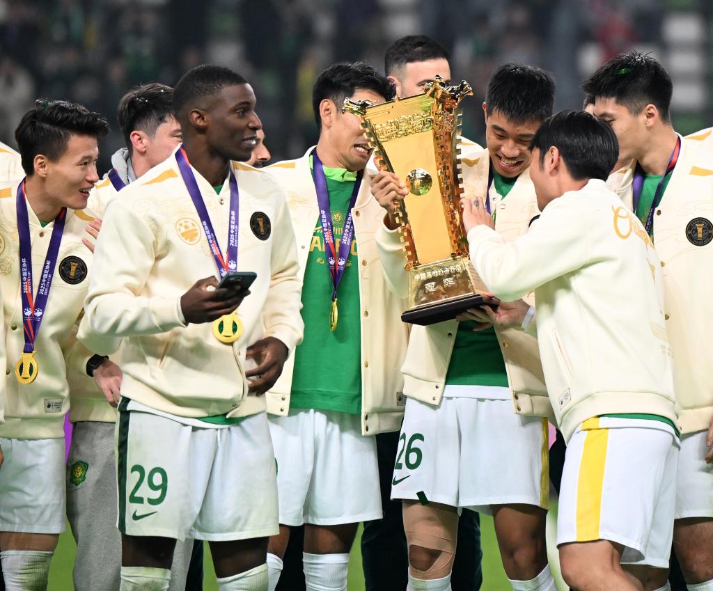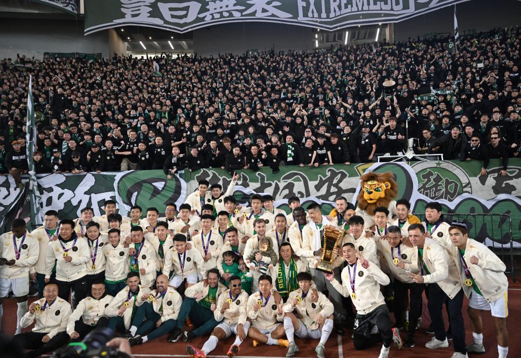12月6日,北京国安队球员在颁奖仪式上庆祝夺冠。
