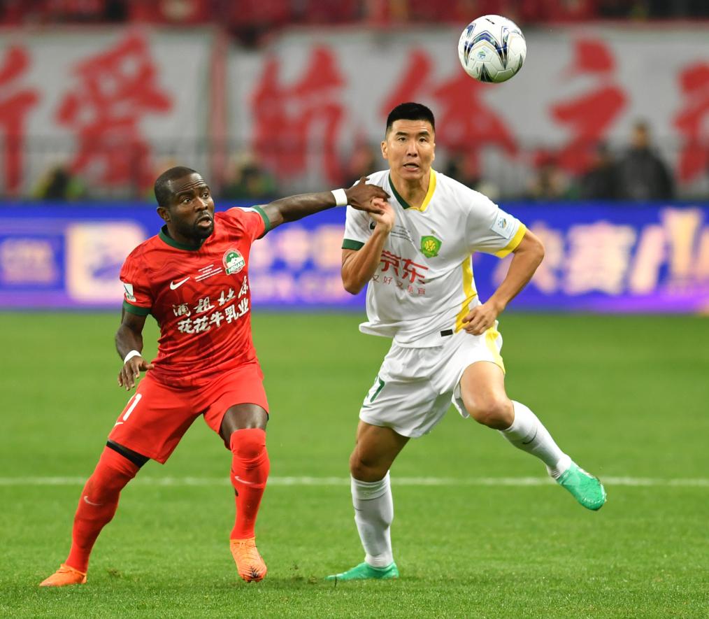 12月6日,河南俱乐部酒祖杜康队球员阿奇姆彭(左)与北京国安队球员王刚在比赛中拼抢。