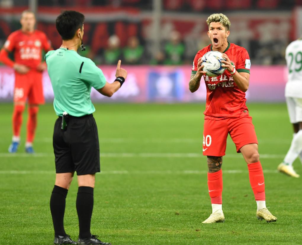 12月6日,河南俱乐部酒祖杜康队球员纳萨里奥(右)对主裁判判罚表示不满。