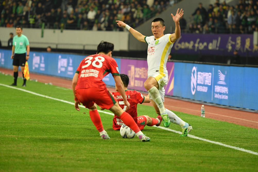 12月6日,北京国安队球员李磊(右)与河南俱乐部酒祖杜康队球员卢永涛(左)和钟义浩在比赛中拼抢。