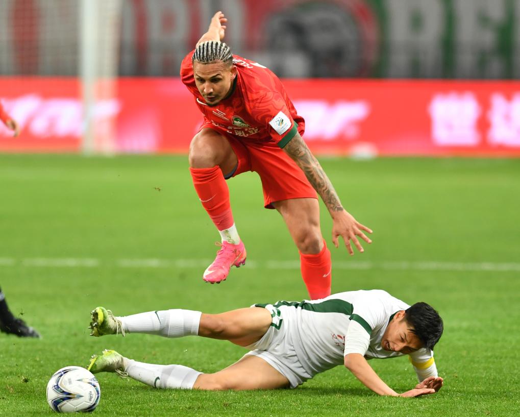 12月6日,河南俱乐部酒祖杜康队球员费利佩·卡多索(左)在比赛中拼抢。
