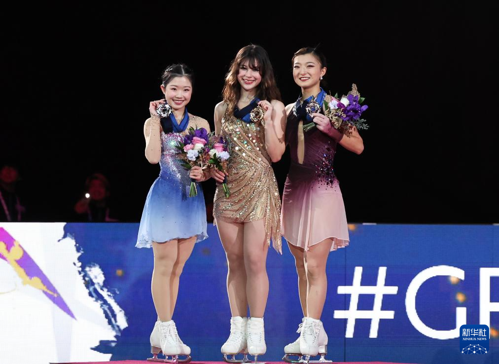 12月6日,冠军美国选手刘美贤(中)、亚军日本选手中井亚美(左)与季军日本选手坂本花织在女子单人滑颁奖仪式后合影。