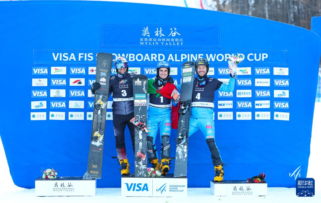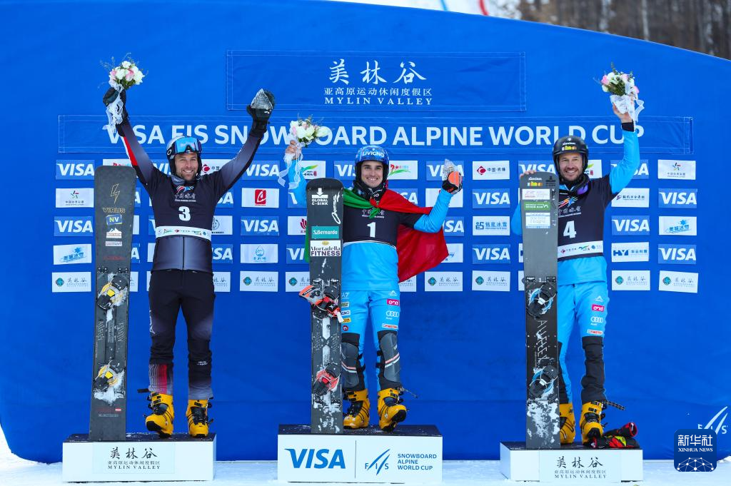 12月6日,冠军意大利选手毛里齐奥(中)、亚军奥地利选手本杰明(左)和季军意大利选手阿伦在颁奖仪式上庆祝。