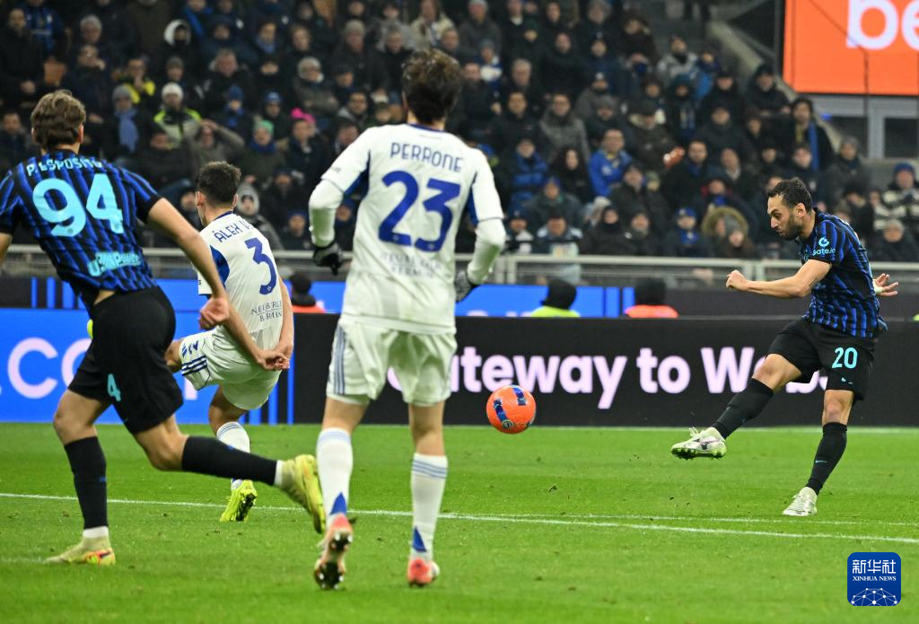 12月6日,国际米兰队球员恰尔汗奥卢(右)在比赛中射门得分。