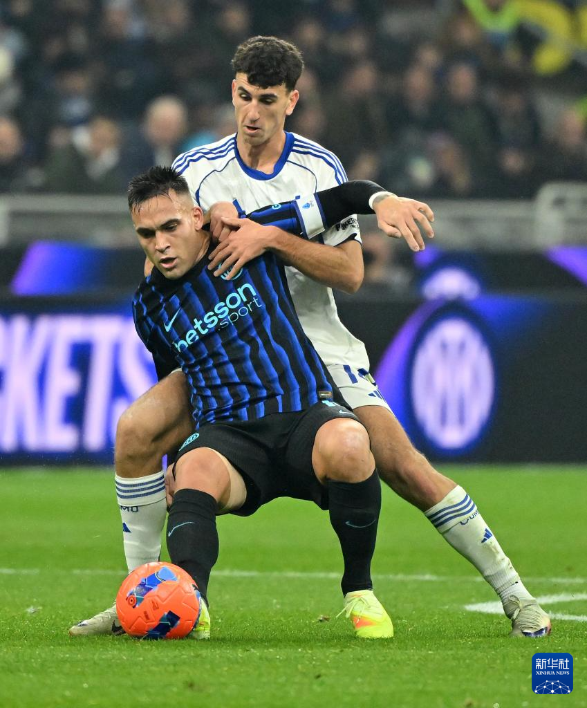 12月6日,国际米兰队球员劳塔罗·马丁内斯(前)与科莫队球员拉蒙在比赛中拼抢。