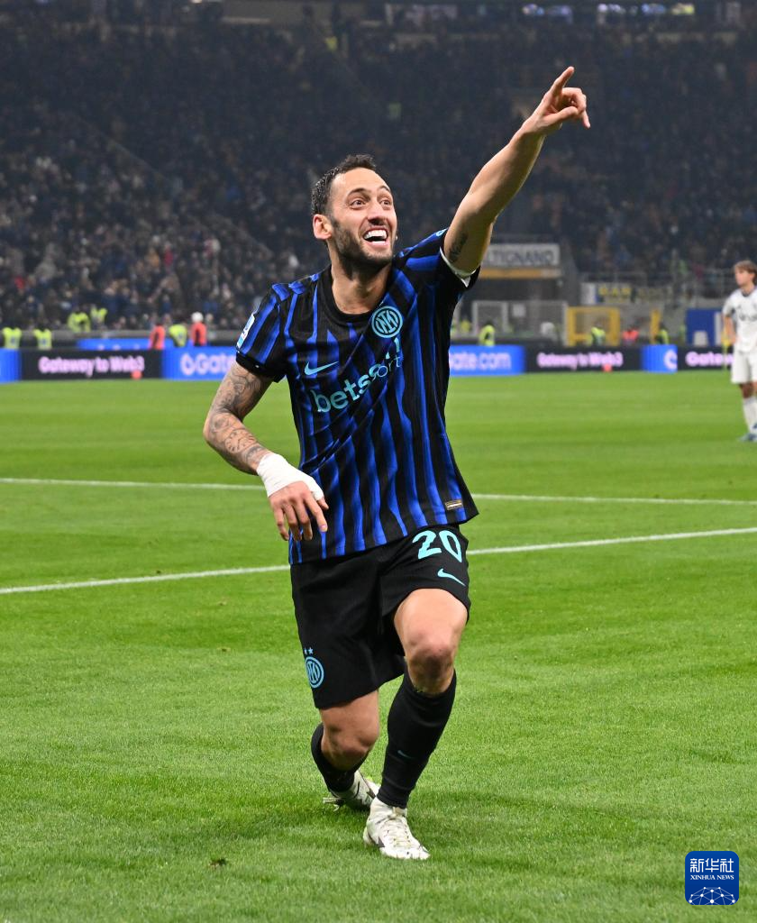 12月6日,国际米兰队球员恰尔汗奥卢庆祝进球。
