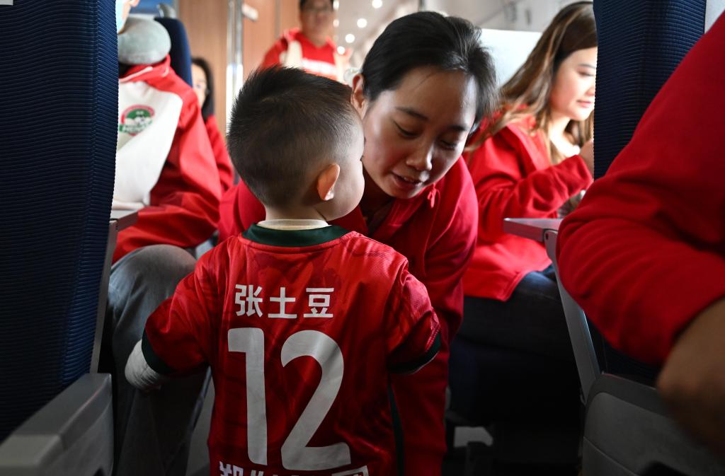 △12月6日,小球迷在列车上准备去看球。新华社记者 李嘉南 摄