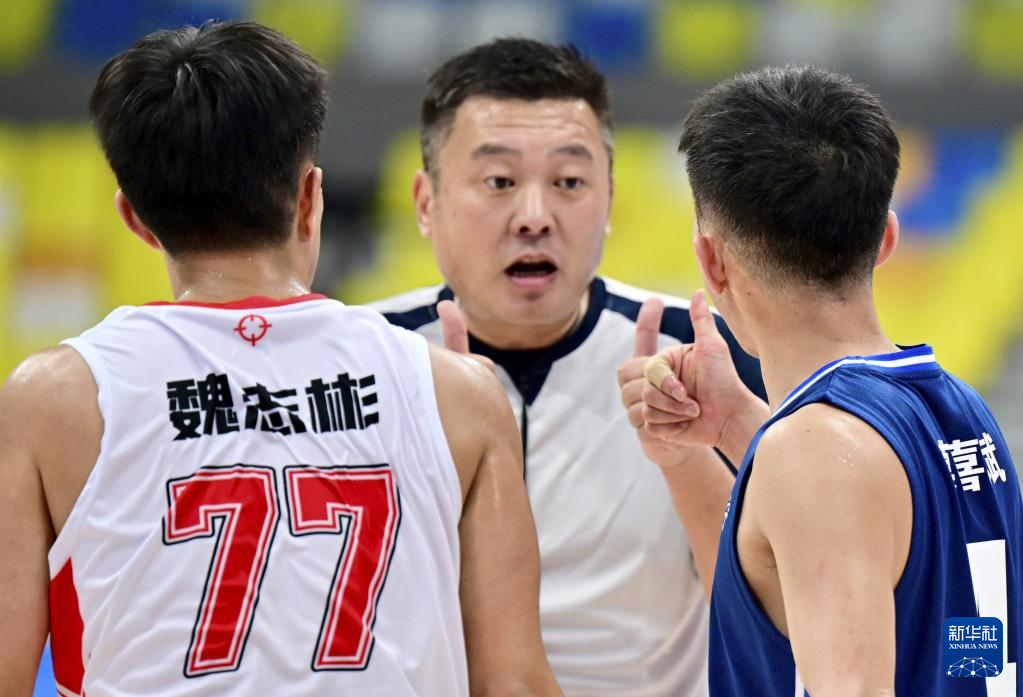 12月11日,辽宁队球员莫喜斌(右)和山东队球员魏志彬在比赛中与裁判用手语交流。